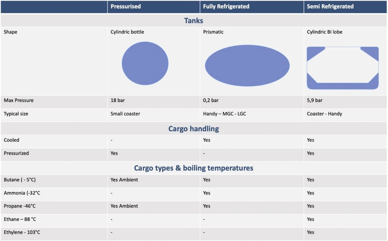 Mid-Sizes: LPG vessels of about 25,000–50,000 cbm, typically fully- refrigerated, carrying ammonia or LPG, on intra-regional routes (e.g. within the Americas or Asia) and medium-haul cross-trades (e.g. in the North Sea and Europe).