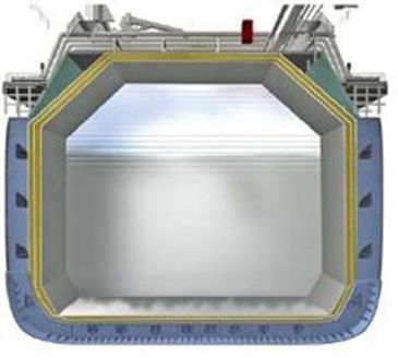 No centreline division is possible in this type of tank. The other system, developed by Technigaz, has a stainless steel membrane as the primary barrier while the secondary barrier is included in